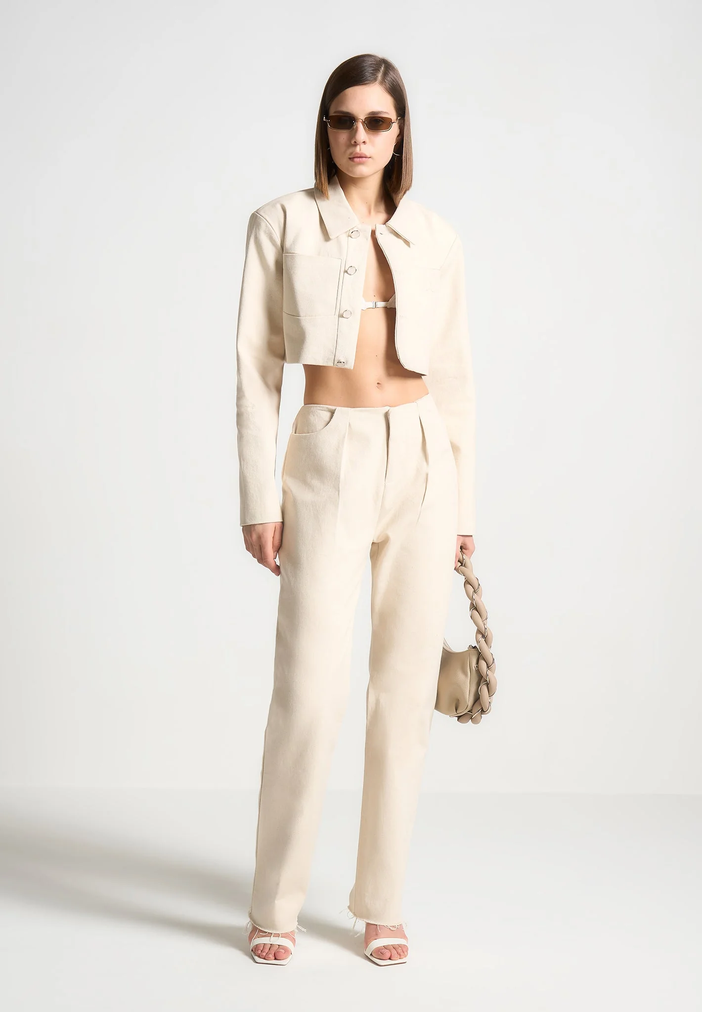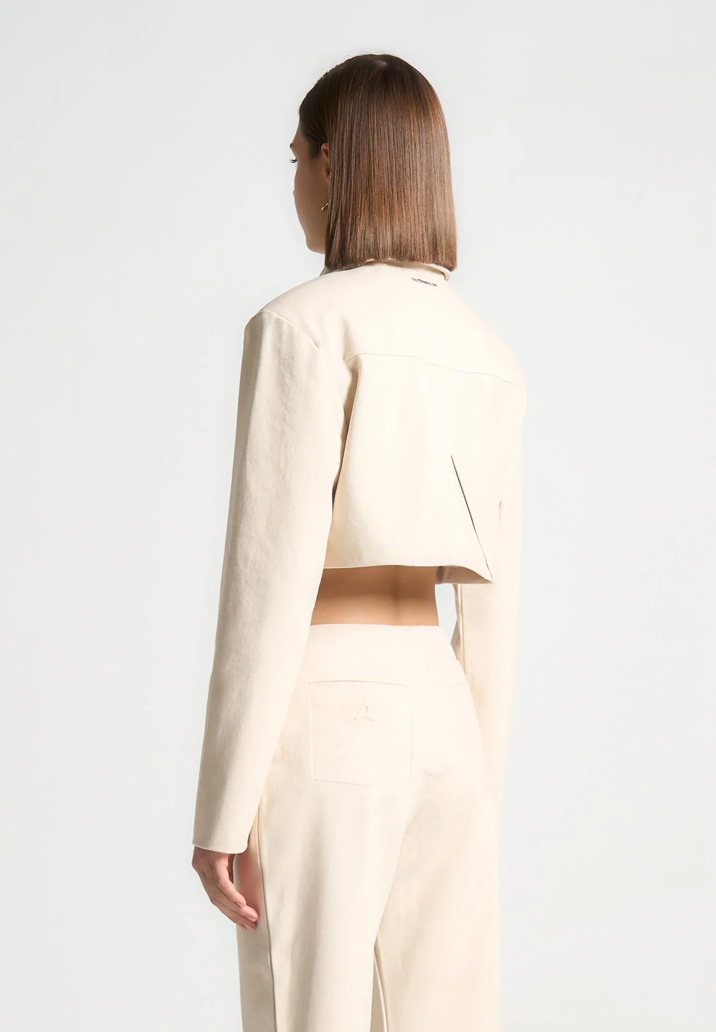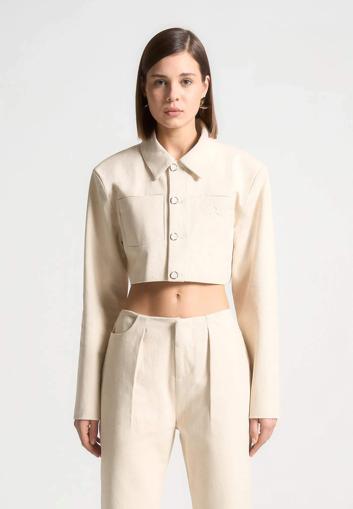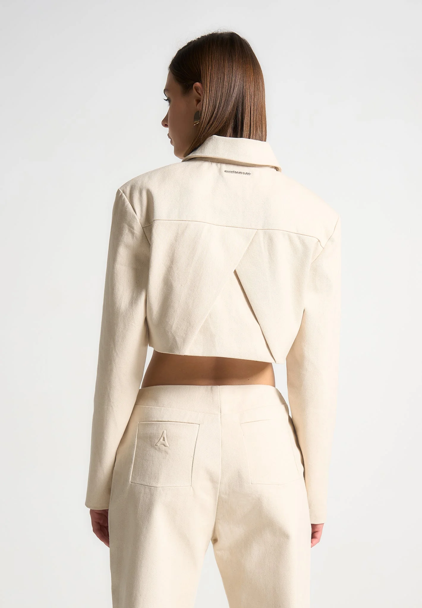 The Wide Shoulder Cropped Denim Jacket is made from a unique speckled denim, providing quality and an on trend look. The design also includes shoulder pads for added comfort and structure, along with a back cross over pleat detail for a touch of sophistication. Add to your wardrobe with this versatile piece.