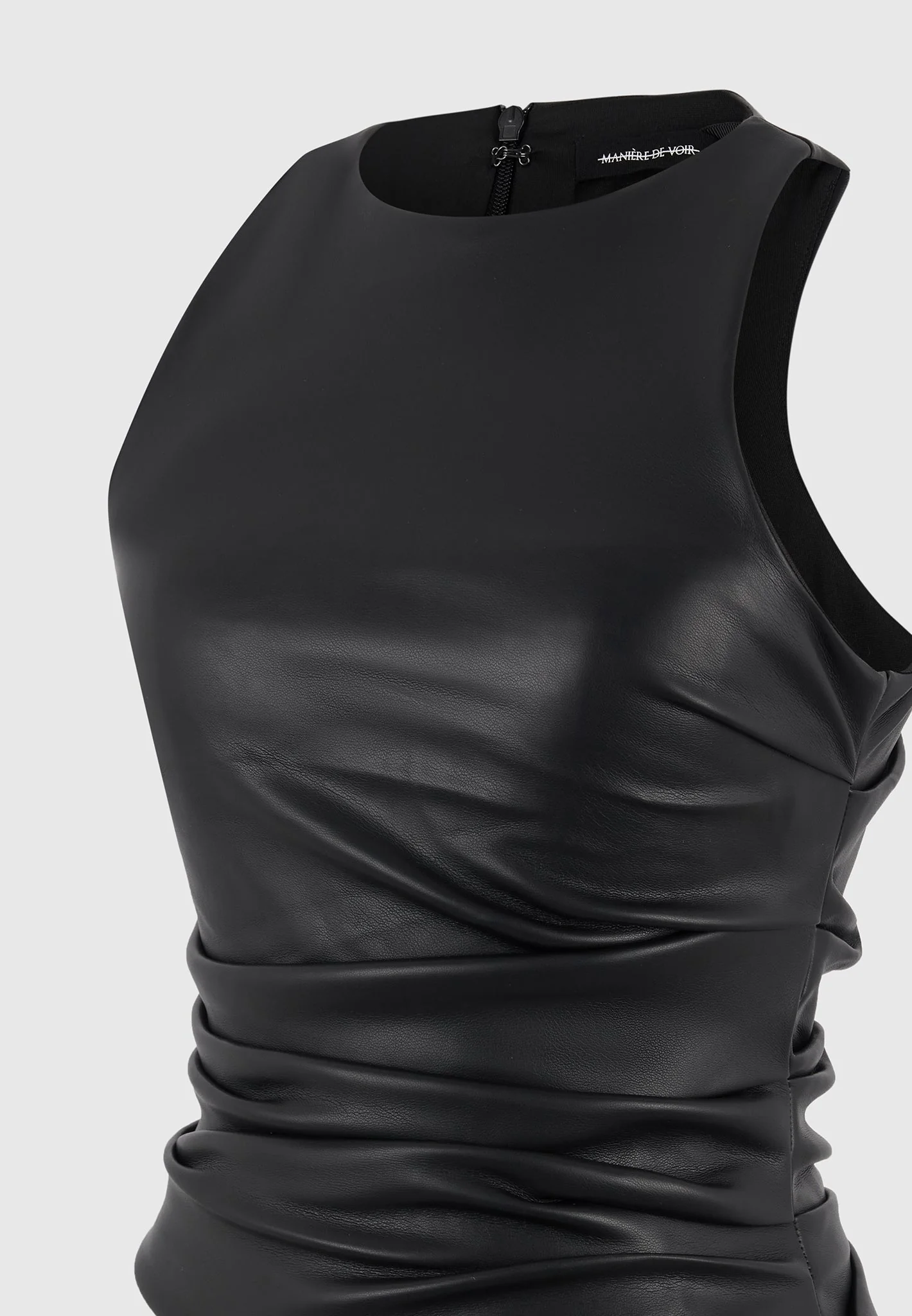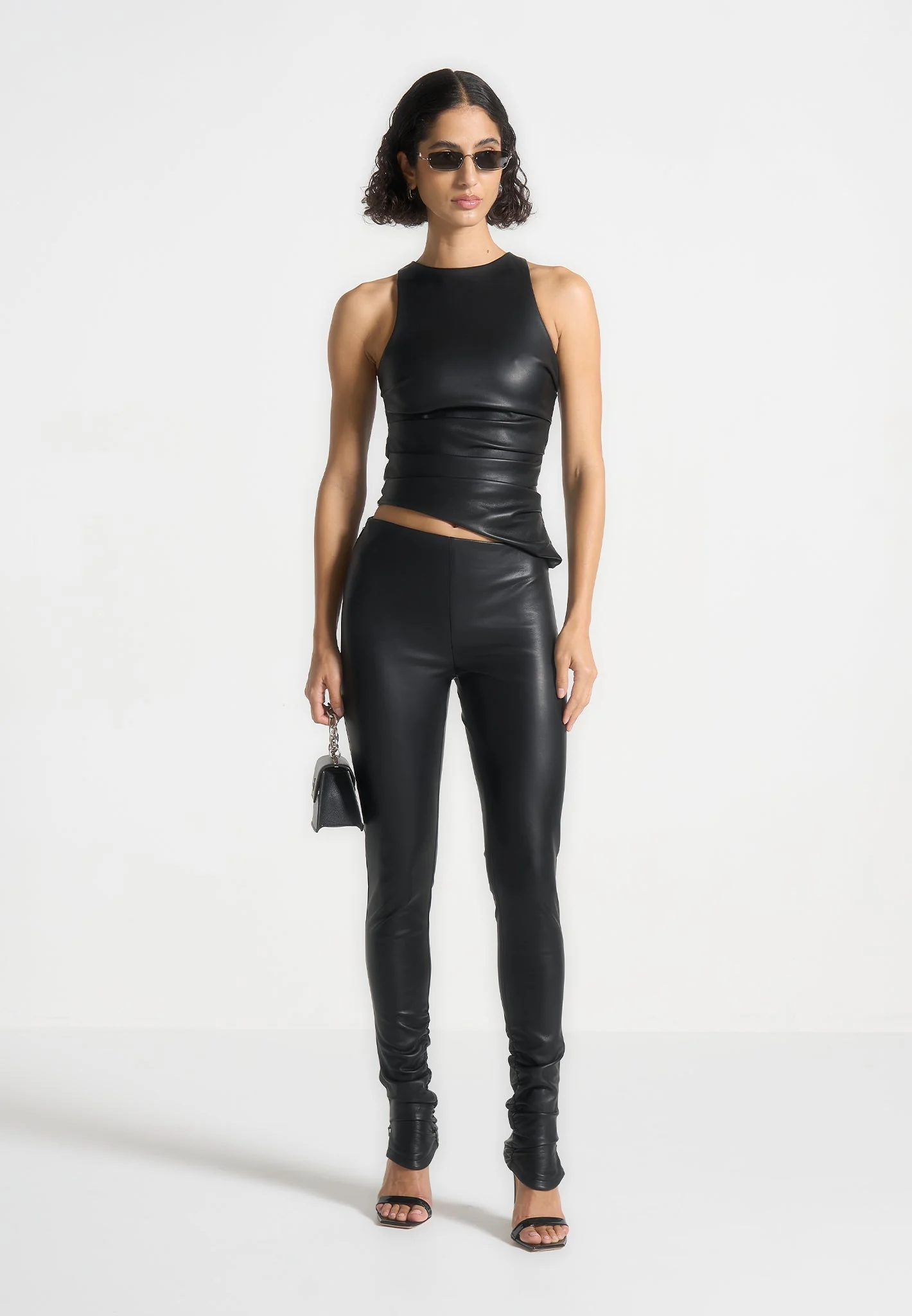This top features a racer neck and a flattering fit, accentuated by gathered detailing. Crafted with premium vegan leather, this top offers a sleek and sophisticated look that effortlessly elevates any outfit.